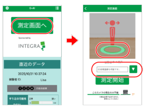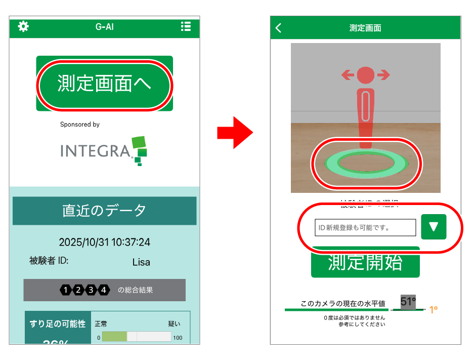 「測定開始」ボタンを押して、カメラに映らないように円形のガイドの近くまで移動します。