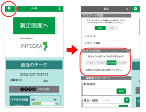 カメラの詳細>InCam1またはInCam2 をタップします。これで測定時のカメラが内カメラに切り替わります。