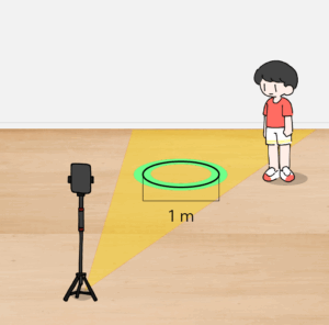 端末のカメラが起動し、写っている映像にガイドが表示されているので、床の円印に合わせてカメラを構えて動かないように固定します。(三脚などを使用するとより安定します。)