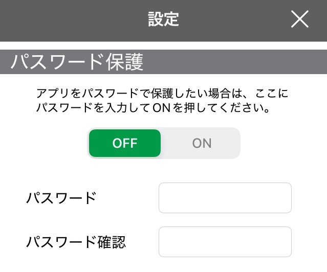 希望のパスワードを英数字で決めて入力し、確認欄にも同じものを入力して、ONに切り替えてください。